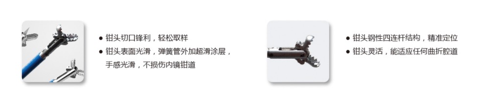 1、鉗頭切口鋒利,輕松取樣;2、鉗頭表面光滑,彈簧管外加超滑涂層,手感光滑,不損傷內鏡鉗道;3、鉗頭鋼性四連桿結構,精準定位;4、鉗頭靈活,能適應任何曲折腔道。